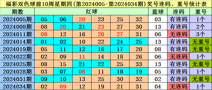 双色球前10周星期四(第2024005-第2024034期)红球号码频次统计: