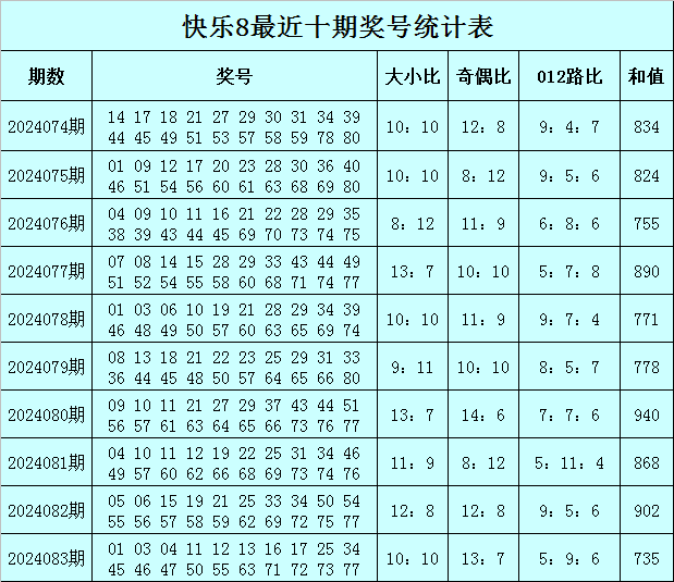 福彩快乐8第2024083期开奖回顾:01 03 04 11 12 13 16 17 25 34 45 46 47 50 55 63 71 72 73 77,其中奖号奇偶比开出13:7,大小比开出10:10,012路比开出5:9:6,和值为735,跨度为76。