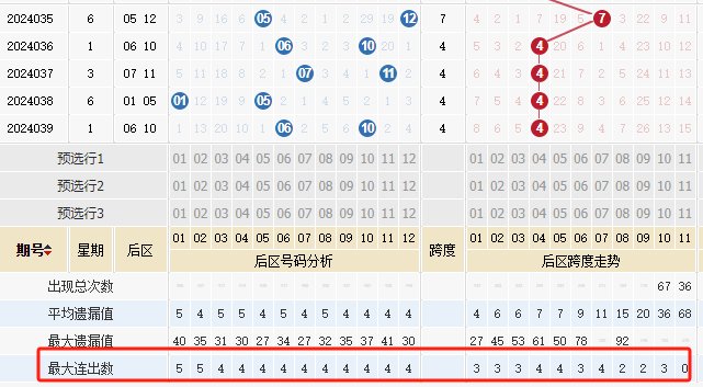 此外,在大乐透历史开奖中,后区连续4期开出同一跨度的情况已为极值,目前从未有过连续5期开出同一跨度的情况发生!那么在周三晚大乐透开奖中,后区跨度连开的情况能否突破历史极值,也是一大看点。