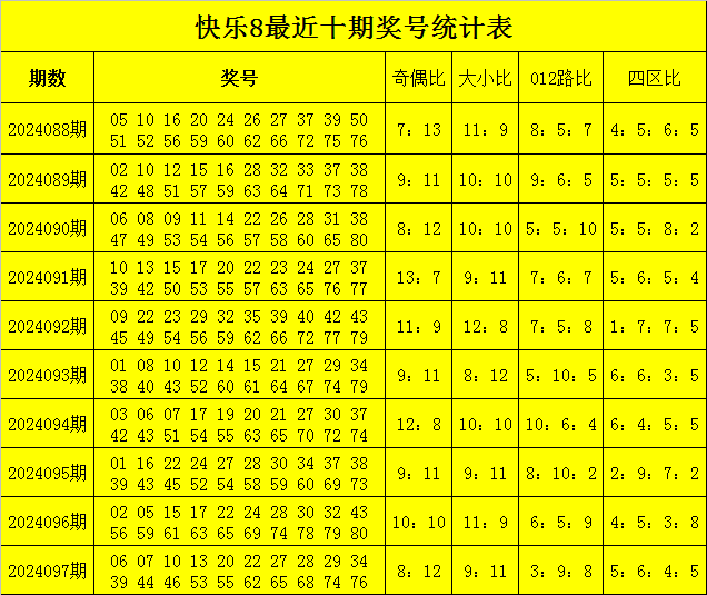 福彩快乐8第2024097期开奖回顾:06 07 10 13 20 22 27 28 29 34 39 44 46 53 55 62 65 68 74 76,其中奖号大小比为9:11,012路比为3:9:8,和值为778,跨度为70,奇偶比为8:12。