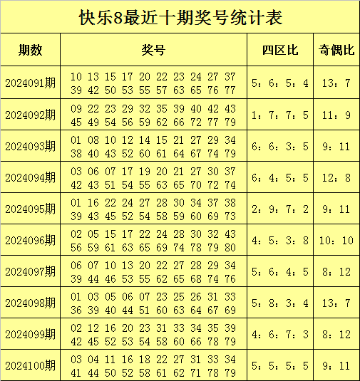福彩快乐8第2024100期开奖回顾:03 04 11 16 18 22 27 31 33 34 41 44 50 52 58 61 62 71 78 79,其中奖号四区比为5:5:5:5,奇偶比为9:11。