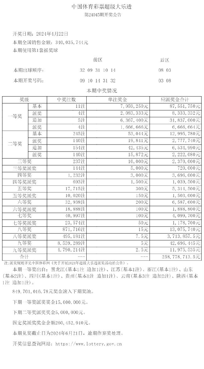 北京时间4月22日晚,体彩超级大乐透第24045期开奖,同时本期也是大乐透10亿大派奖的第16期。当期开奖号码为前区09 10 14 31 32,后区03 08。