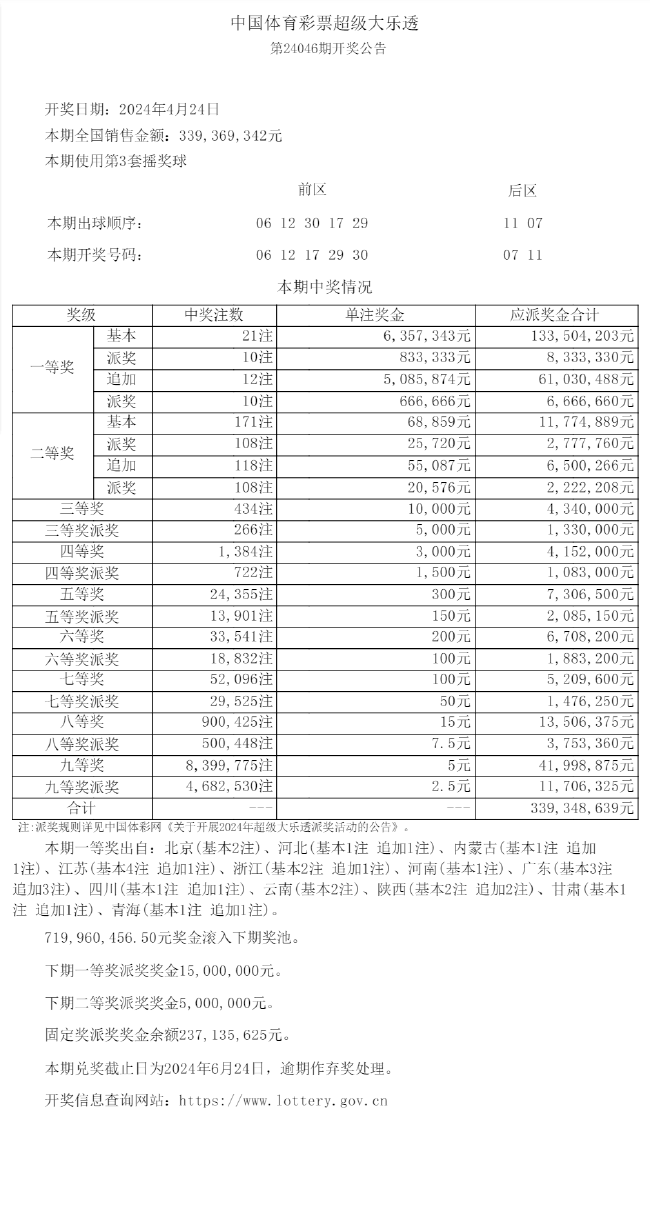 北京时间4月24日晚,体彩超级大乐透第24046期开奖,同时本期也是大乐透10亿大派奖的第17期。当期开奖号码为前区06 12 17 29 30,后区07 11。值得一提的是,本期大乐透头奖井喷21注,却没有亿元奖产生。
