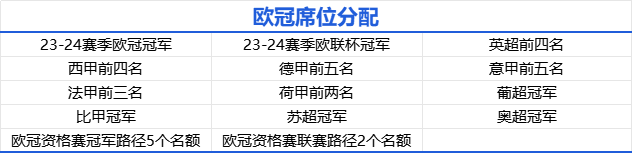 下赛季欧冠扩军至36队,具体名额分配如上表所示,意甲和德甲额外获得了欧战积分的奖励席位,即意甲前4可直通欧冠,而第5名也可通过奖励席位参加正赛,但以上都因为亚特兰大夺下欧联杯而产生了变化。