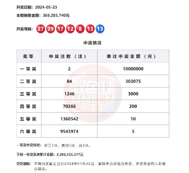 22:10 本期一等奖开出2注,单注奖金1000万元,头奖分落浙江和贵州;二等奖开出84注30.3万余元。本期双色球全国销量为3.69亿元,计奖结束后奖池余额为22.9亿余元。