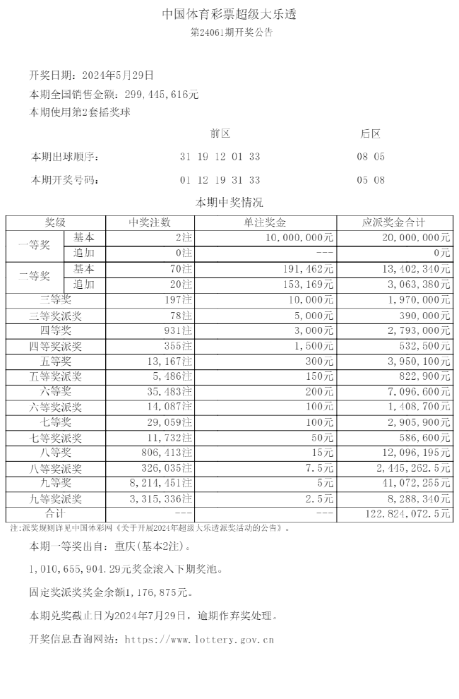 北京时间5月29日晚,体彩超级大乐透第24061期开奖,同时本期也是大乐透10亿大派奖的第32期。当期开奖号码为前区01 12 19 31 33,后区05 08。