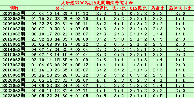 大乐透第062期历史同期奖号分析: