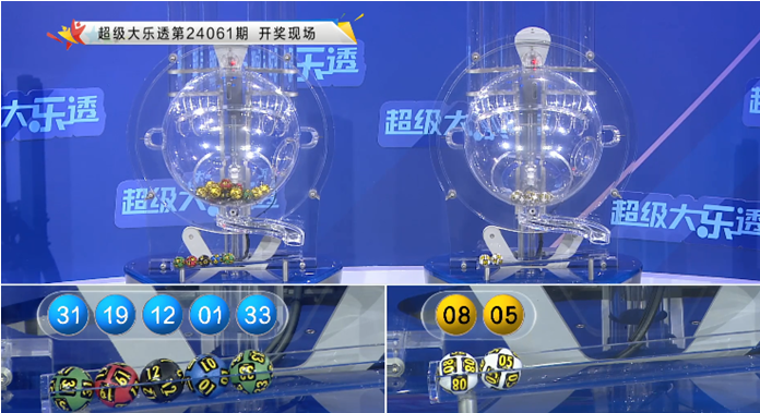 开奖回顾:体彩大乐透第24061期奖号为:01 12 19 31 33+05 08,前区奖号012路比为2:3:0,奇偶比为4:1,大小比为3:2,后区开出一大一小组合。