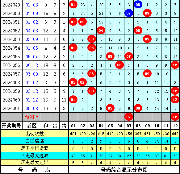 6、在历史同期第062期开奖中,后区全大组合出现6次,全小组合出现2次,一大一小组合出现9次,本期看好后区开出全大组合,参考号码07、08、09、12。
