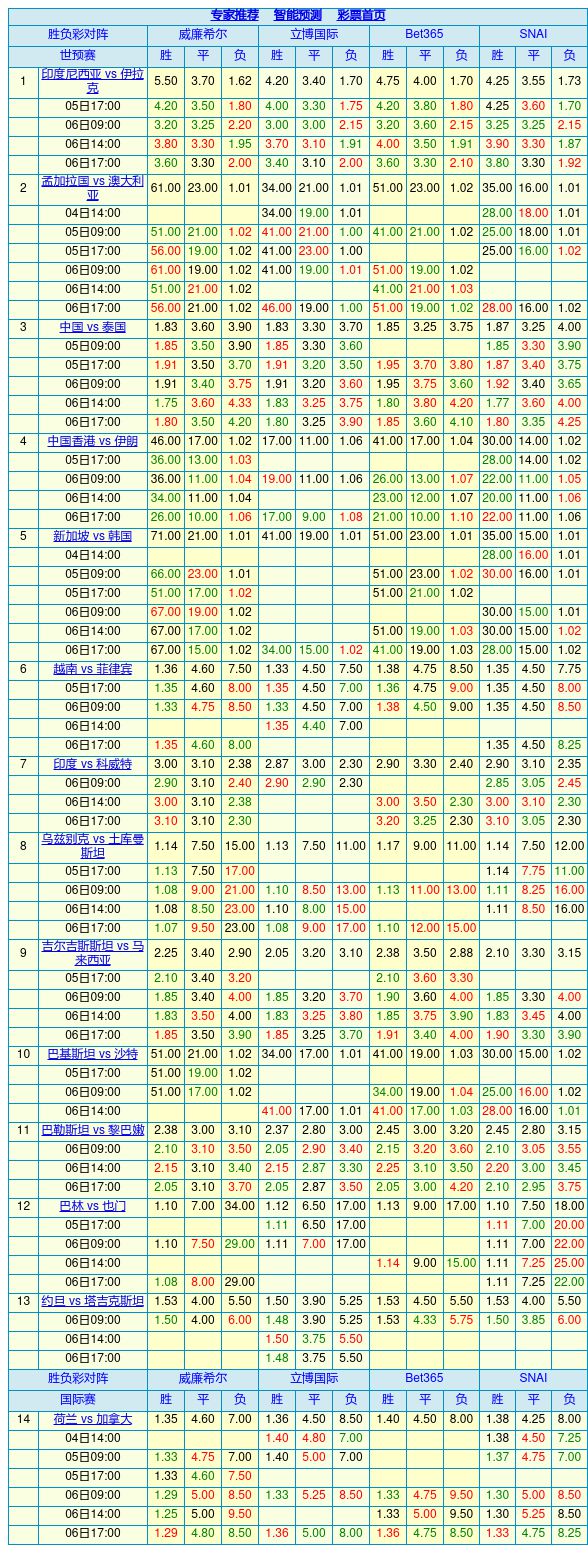 胜负彩24090期欧洲四大机构最新赔率(17:00)