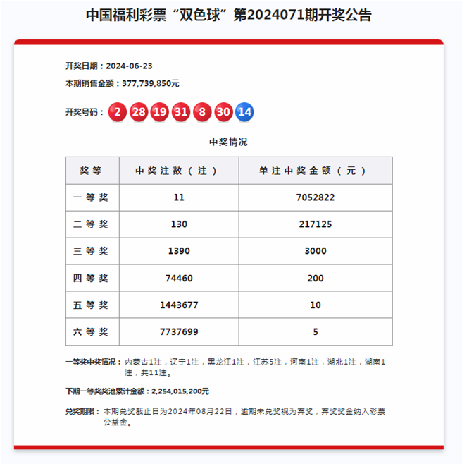 开奖回顾:双色球第2024071期奖号为:02 08 19 28 30 31 + 14。