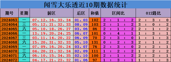 上期回顾:大乐透开奖:前区04 17 21 23 32后区01 06,当前前区和值97,区间比1:3:1,012路比1:1:3。