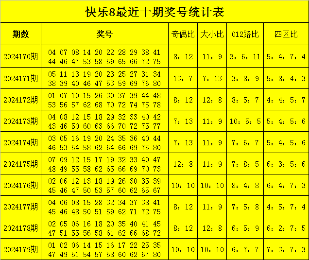 福彩快乐8第2024179期开奖回顾:01 02 06 14 15 16 17 22 25 35 47 49 51 54 57 58 60 62 67 80,其中奖号大小比为10:10,012路比为6:7:7,和值为738,跨度为79,奇偶比为10:10。
