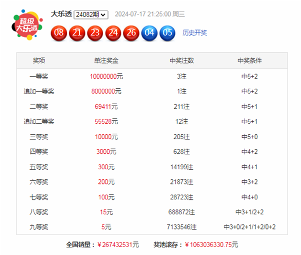 大乐透第2024082期开奖号码为:08、21、23、24、26+04 05。其中前区奖号三区比为1:2:2,奇偶比为2:3,没有开出重号,后区分布在一、二区。
