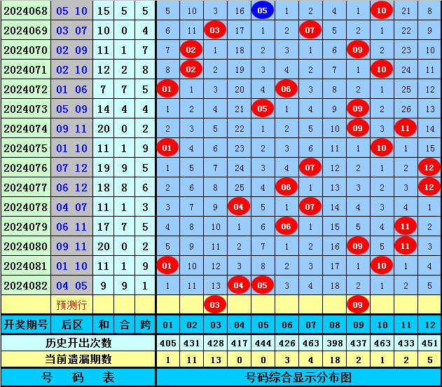 后区分析【一区01-04,二区05-08,三区09-12】:上期后区奖号为04和05,分别落在第一、二区,近50期后区三区比为28:40:32,近10期三区比为4:6:10,本期注意第一、三区号码出现,关注两码03+09。