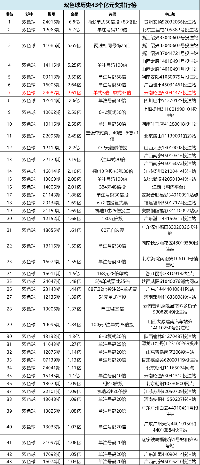 这是双色球在2024年开出的第4个亿元奖,距离2024年4月28日晚陕西咸阳双色球1.48亿巨奖相隔93天。同时,这也是双色球历史上第43个亿元奖,此次云南中出的2.61亿,排名双色球亿元奖历史第7位。