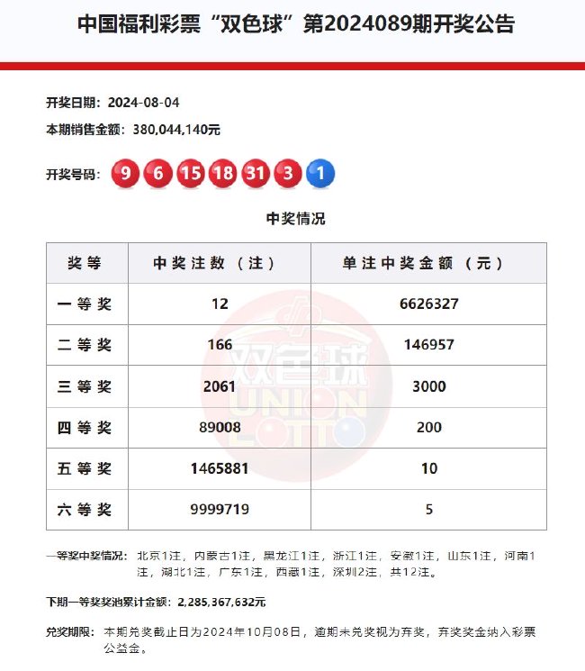 北京时间2024年8月4日,福彩双色球第24089期开奖,以下是详细开奖流程: