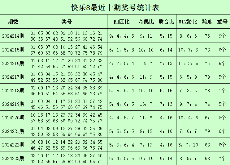 福彩快乐8第2024223期开奖回顾:03 10 11 12 13 18 30 35 37 40 42 52 56 57 59 62 63 65 66 71,其中奖号四区比为6:4:5:5,奇偶比为10:10,质合比为6:14,跨度为68,012路比为8:5:7,开出7个重号:10、12、35、52、56、65、66。