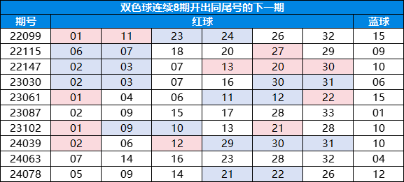 在今年的99次双色球开奖中,共出现4次连续8期开出同尾号的情况,同尾形态在今年双色球开奖中的火热程度可见一斑!小编统计了近10次双色球连续8期开出同尾号的下一期奖号,总结出以下几个特点,可供彩民参考。