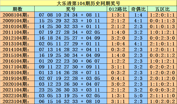 上期开奖:大乐透第2024103期开奖:19、21、29、32、33+06、08,前区012路比为2:1:2,奇偶比为4:1,五区比为0:0:2:0:1,大小比为5:0。