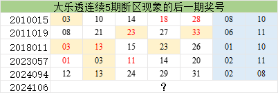 而上一次前区连续5期开出断区形态,是在2024089期-2024093期之间,距离本次的2024101期-2024105期区间仅仅相差7期,可见这一形态近期呈现超级火爆的态势。