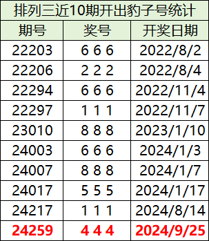 北京时间9月25日晚,体彩排列三第24259期开奖,当期开奖号码为“444”的豹子号。开奖号码一经揭晓,便引起了彩民朋友们的热议。此次豹子号距离上次开出相隔42天,同时这也是2024年第5次出现豹子号!