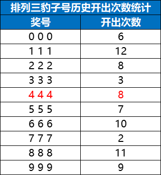 截至目前,体彩排列三豹子号现身76次,其中,豹子号“111”为最热号码,共开出过12次排名第一;本次的“444”是第8次开出,与“888”并列第五位。此外,排列三上一次开出“444”还有追溯到2022年4月20日开出的22100期号码,距今已经过去889天。