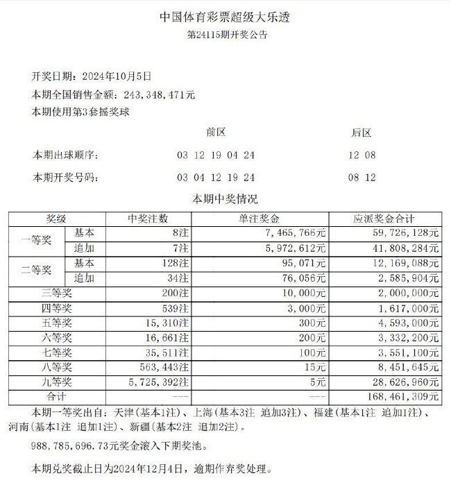 北京时间10月5日晚,体彩大乐透第24115期开奖,当期开奖号码为前区03 04 12 19 24,后区08 12。