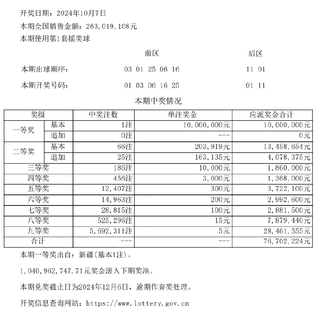 北京时间10月7日晚,体彩大乐透第24116期开奖,当期开奖号码为前区01 03 06 16 25,后区01 11。