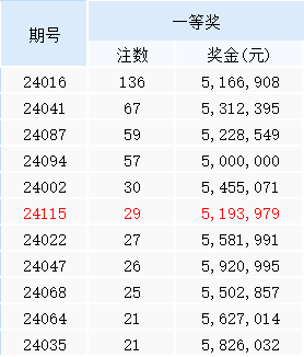 北京时间2024年10月8日,福彩双色球第24115期开奖,当期开奖号码为红球03 10 11 19 27 28,蓝球07。本期双色球一等奖迎来井喷,爆出高达29注头奖,排在2024年一等奖注数第六位,不过遗憾没有亿元奖;此外,由于时隔40期开出了高遗漏蓝球07码,使得当期六等奖迎来井喷,其他奖级也有不同程度的增长,导致二等奖奖金3.9万元为今年第四低。