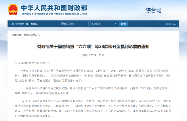 9月28日,财政部网站公布《财政部关于同意销毁“六六顺”等28款即开型福利彩票的通知》(财综〔2024〕37号),根据《彩票管理条例》(国务院令第554号)、《彩票管理条例实施细则》(财政部 民政部 体育总局令第96号)和《彩票发行销售管理办法》(财综〔2018〕67号)等有关规定,同意中国福利彩票发行管理中心采用粉碎方式组织销毁已经停止销售的“六六顺”等28款即开型福利彩票,共计98.8566万张,票面总值共计1000.4635万元。要严格执行彩票销毁相关规定,在民政部监督下组织开展销毁工作。