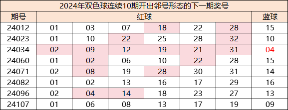 在今年的双色球开奖中,邻号形态一直处于高热度态势。第24002期到第24037期更是完成了36连开,而在昨晚再次开出邻号形态后,目前也处于10连开的态势之中。小编统计了今年双色球连续开出10次邻号形态的后一期奖号,共有8期,总结出以下几个特点,可供彩民选号时参考。