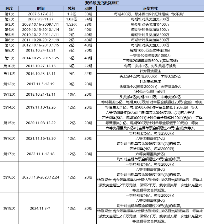 双色球游戏自2007年起展开派奖活动,除2007年分两次进行派奖外,此后每年都会在年末与我们准时见面,而本年度12亿大派奖已是第19次。笔者将这19次派奖活动的时间和派奖形势进行总结对比如下: