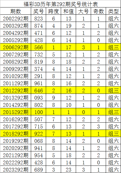 从以上统计可以看出,历年3D第292期开出了4次组三号码,开出了18次组六号码。组六号码出现概率大,本期预计开出组六号码。
