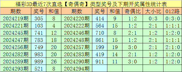 前7次出现奇偶奇类型奖号分别为:305、103、741、783、749、983、989,其下期分别开出奖号:414、564、710、861、199、419、911。