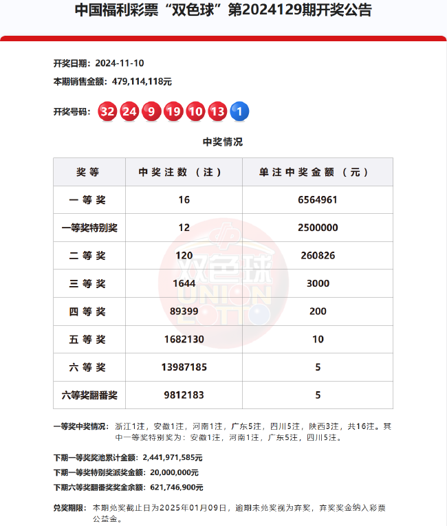 北京时间11月10日,福彩双色球第24129期开奖,同时本期还是双色球12亿大派奖第4期开奖,当期开奖号码为红球09 10 13 19 24 32,蓝球01。本期一等奖开出16注656万余元,其中12注获得一等奖特别奖加奖250万元,单注奖金达到906万余元,12注一等奖特别奖分落安徽、河南、广东(5注)、四川(5注),广东、四川或爆4532万大奖。4注基本头奖分落浙江、陕西(3注)。二等奖开出120注26万余元。本期销量4.79亿元,计奖结束后,奖池余额24.41亿余元。