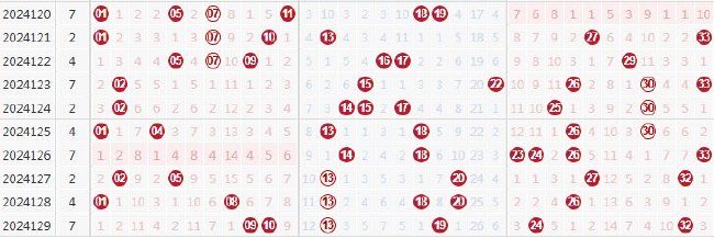 据笔者统计,直落3期(含超过3期)奖号在今年已经现身过20次,热度相当之高!此前10次直落号中,仅有1次为直落4期奖号,其余全部都为直落3期,而且近8期直落奖号形态中,全部都停留在直落3期,恐怕下期红球13码继续直落的概率不会太高。