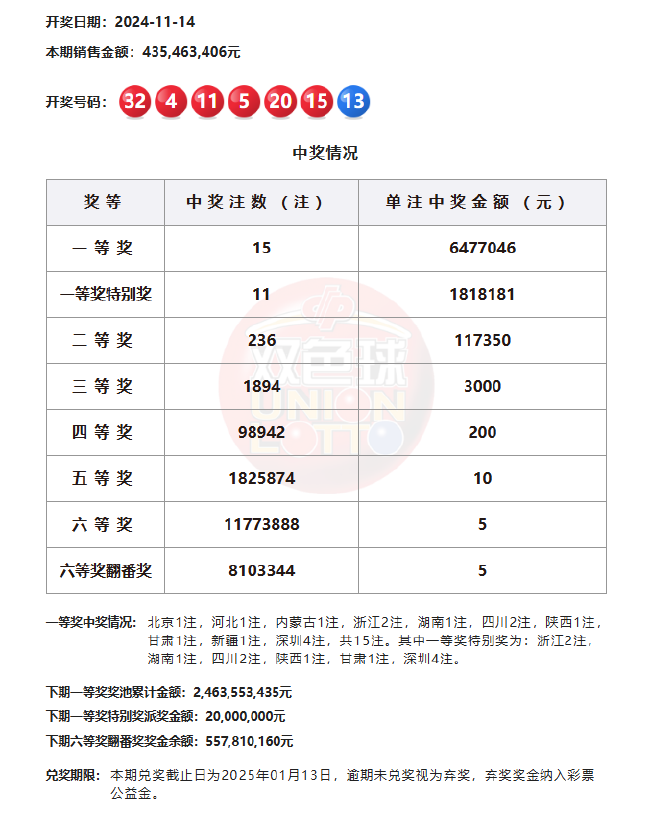 北京时间11月14日,福彩双色球第24131期开奖,同时本期还是双色球12亿大派奖的第6期开奖,当期开奖号码为红球04 05 11 15 20 32,蓝球13。本期一等奖开出15注647万余元,其中11注获得一等奖特别奖加奖181万余元,单注奖金达到829万余元。11注一等奖特别奖分落浙江(2注),湖南,四川(2注),陕西,甘肃,深圳(4注);4注基本头奖分落北京、河北、内蒙古、新疆。二等奖开出236注,单注奖金11.7万余元。本期销量4.35亿元,计奖结束后,奖池余额24.63亿余元。
