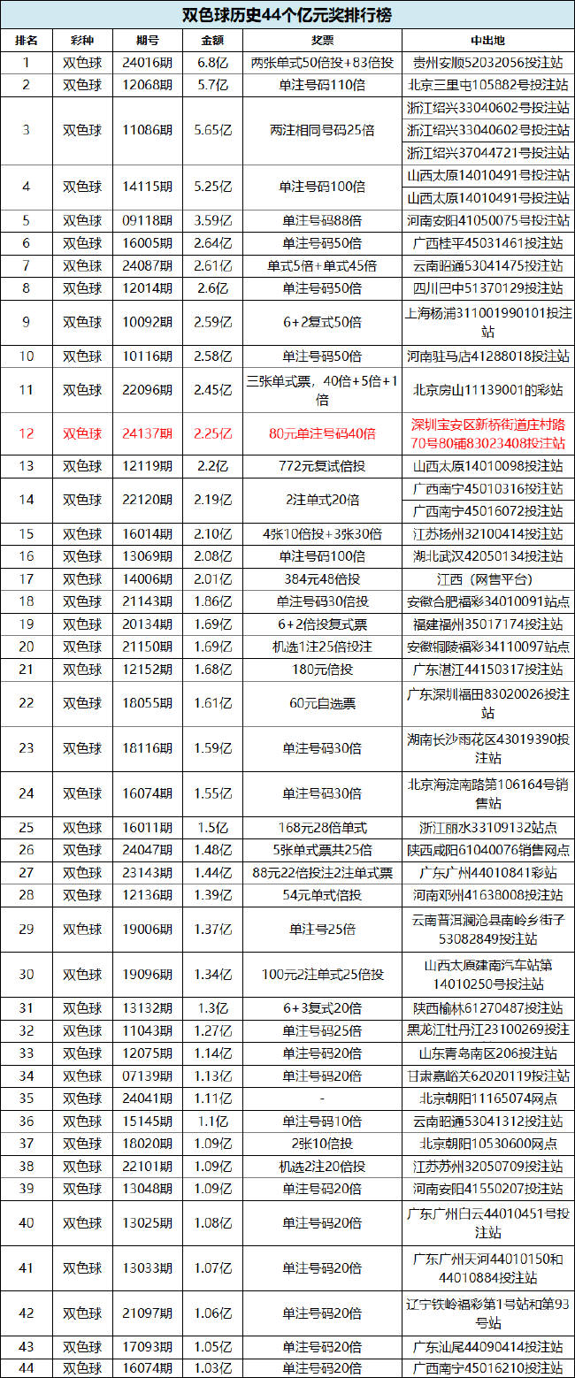 这是双色球在2024年开出的第5个亿元奖,距离2024年7月30日晚云南昭通双色球2.61亿巨奖相隔121天。同时,这也是双色球历史上第44个亿元奖,此次深圳中出的2.25亿,排名双色球亿元奖历史第12位。