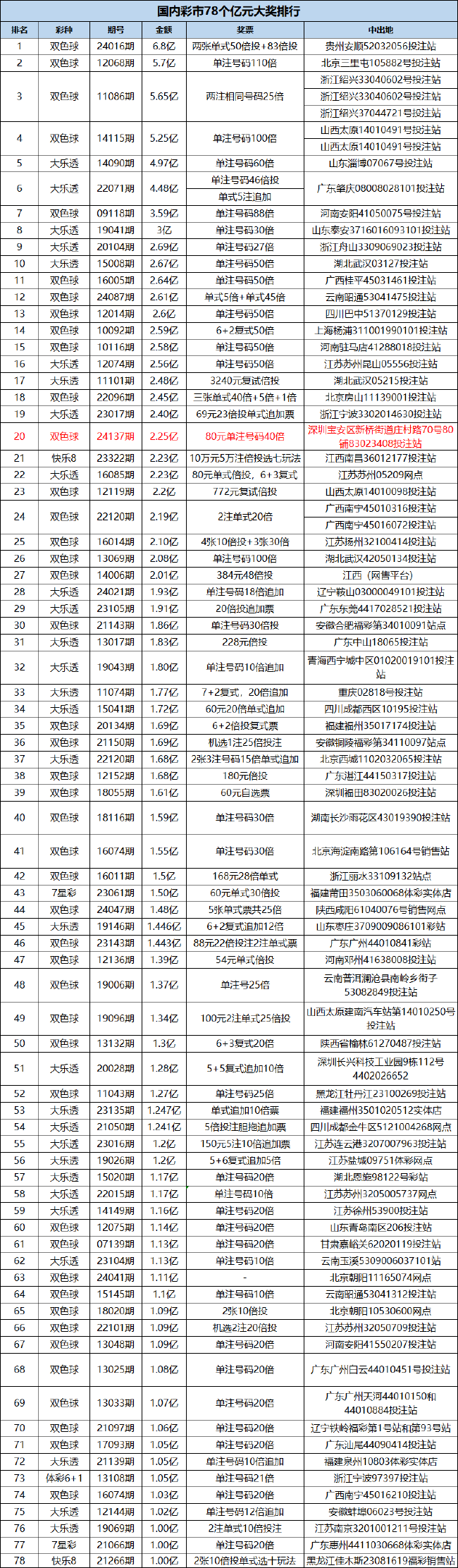 这是今年国内彩市开出的第6个亿元奖,距离上一次云南昭通双色球2.61亿相隔121天,这也是福彩双色球历史第44次开出亿元大奖,也是今年开出的第5个双色球亿元奖。同时,这是国内彩市历史上开出的第78个亿元奖,本次双色球2.25亿排名第20位!