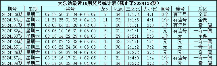 大乐透第2024138期奖号为:05、17、20、28、34+04、09。其中前区三区比为1:2:2,大小比为3:2,包含1个重号,没有出现连号,后区为一奇一偶号码。