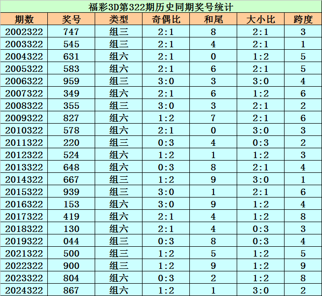 福彩3D历年第322期同期奖号为:747 545 631 583 959 349 355 827 578 220 524 648 667 939 153 419 130 044 500 900 804 867。