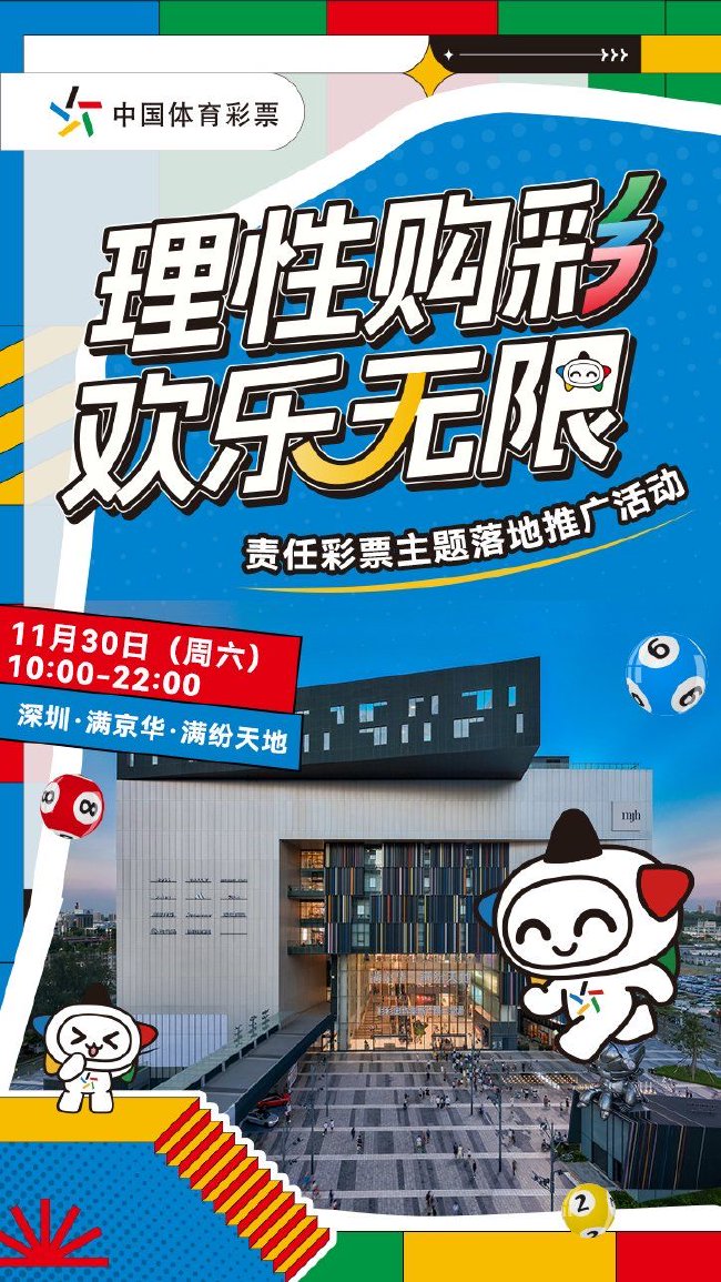 11月30日10:00-22:00(本周六),深圳体彩在宝安区满京华·满纷天地(正门室外广场)约定你,期待与您共赴这场“理性购彩 欢乐无限”的精彩之旅,一起在欢乐中了解理性购彩理念,共同定格美好瞬间!