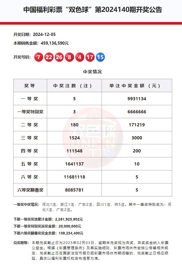 北京时间12月5日,福彩双色球第24140期开奖,同时本期还是双色球12亿大派奖的第15期开奖,当期开奖号码为红球04 07 08 17 22 26,蓝球15。本期一等奖开出5注,单注奖金993万余元,其中3注获得一等奖特别奖加奖666万余元,单注奖金达到1659万余元。3注一等奖特别奖分落广东(2注)和河北(1注);2注基本头奖分落浙江和四川。二等奖开出180注,单注奖金17.1万余元。本期双色球销量4.59亿元,计奖结束后,奖池余额22.61亿余元。