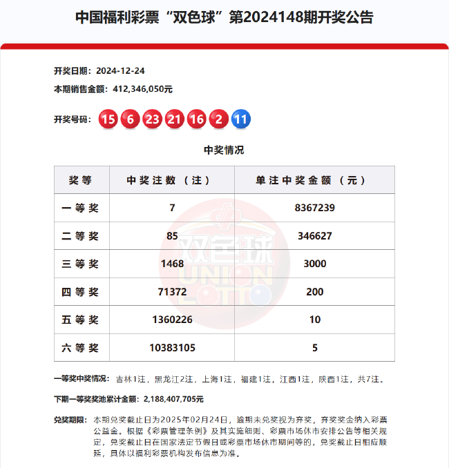 北京时间2024年12月24日,福彩双色球第24148期开奖,以下是详细开奖流程: