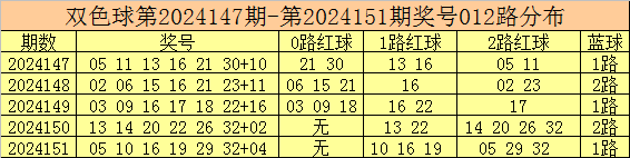 开奖回顾:双色球第2024151期开出奖号:05 10 16 19 29 32 + 04。其中,红球号码012路比为0:3:3,其中0路号码表现相对较冷。蓝球号码为1路号码。