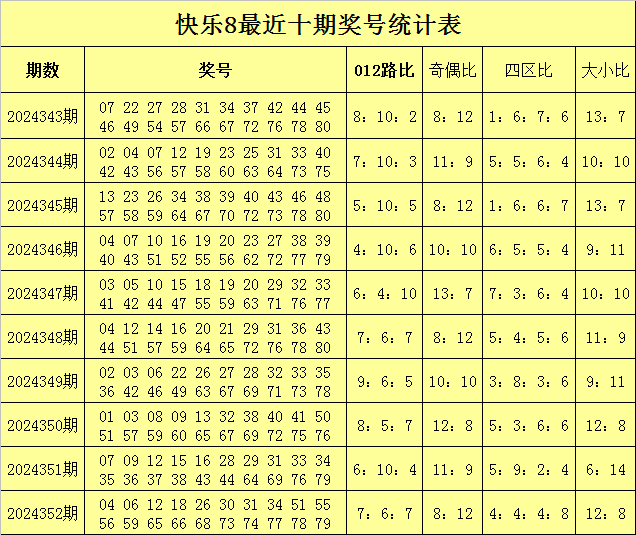 福彩快乐8第2024352期开奖回顾:04 06 12 18 26 30 31 34 51 55 56 59 65 66 68 73 74 77 78 79,其中奖号012路比为7:6:7,四区比为4:4:4:8奇偶比为8:12,大小比为12:8。