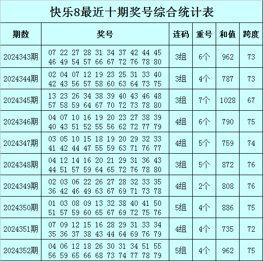 福彩快乐8第2024352期开出奖号:04 06 12 18 26 30 31 34 51 55 56 59 65 66 68 73 74 77 78 79,其中奖号和值为962,跨度为75,包含4个重号12、31、34、79,包含连码30 31、55 56、65 66、73 74、77 78 79。