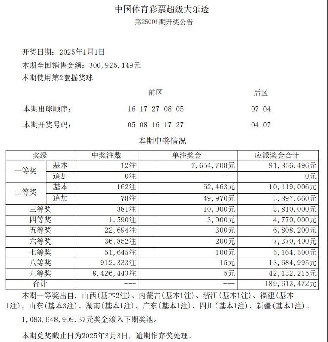 北京时间1月1日晚,体彩大乐透第25001期开奖,当期开奖号码为前区05 08 16 17 27,后区04 07。