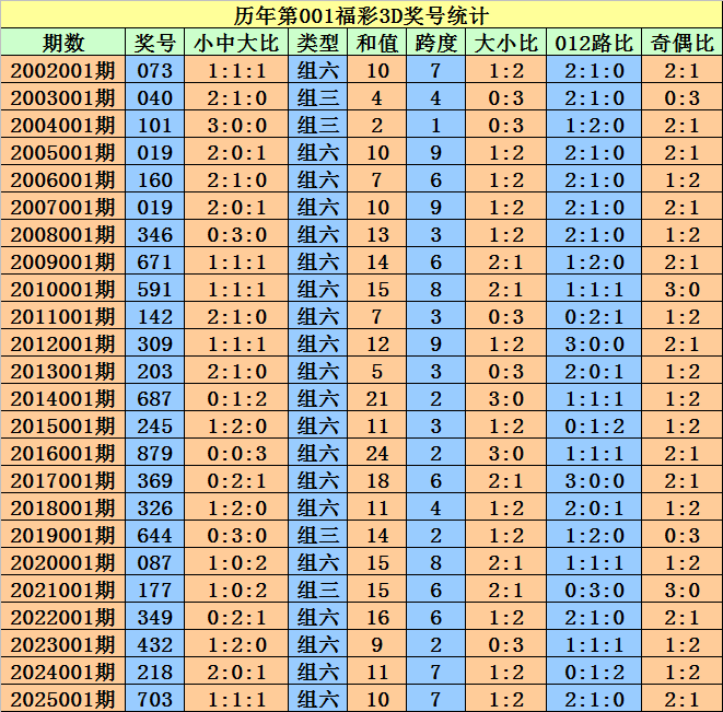 开奖回顾:福彩3D第2025001期奖号为:703。